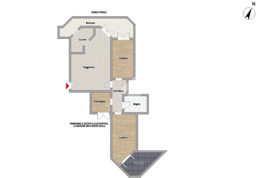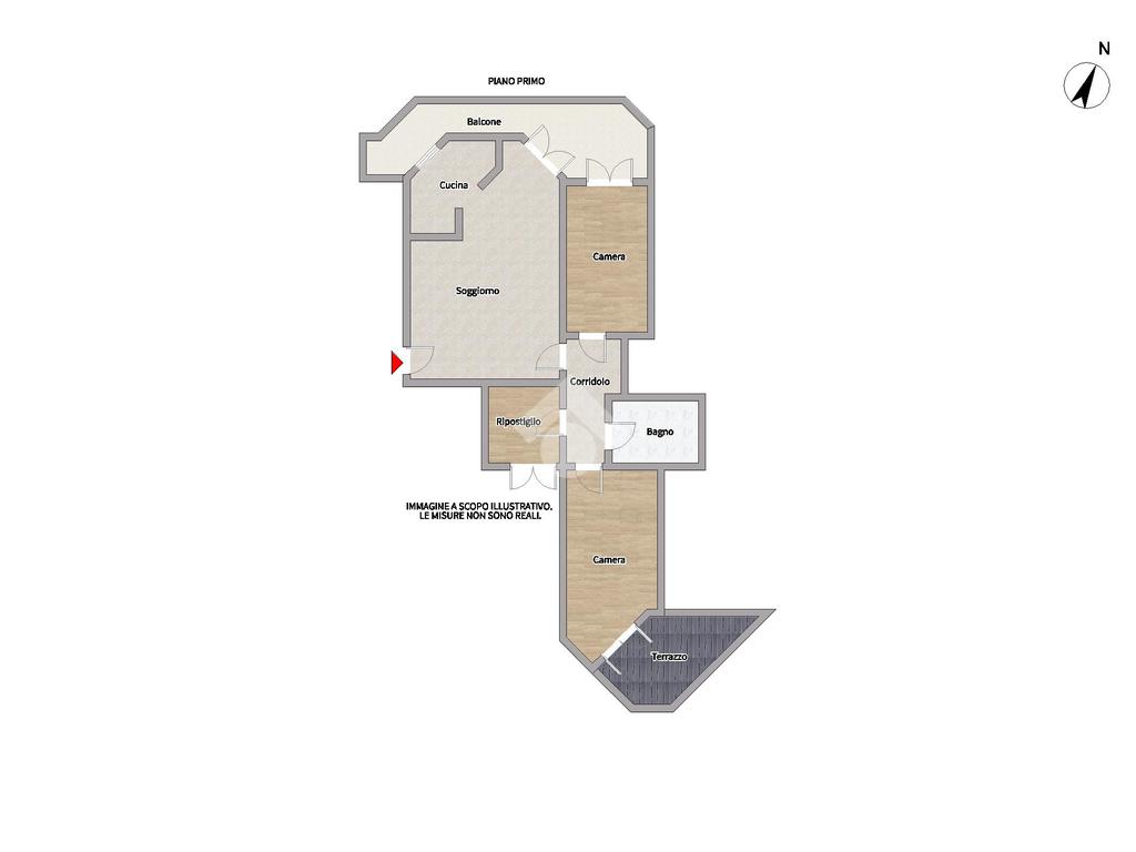 All'ingresso troviamo una zona giorno con angolo cottura e accesso ad un balcone abitabile; nella zona notte una camera da letto doppia con accesso al balcone e una camera matrimoniale, con accesso al terrazzino privato, un ripostiglio e un bagno con doccia.