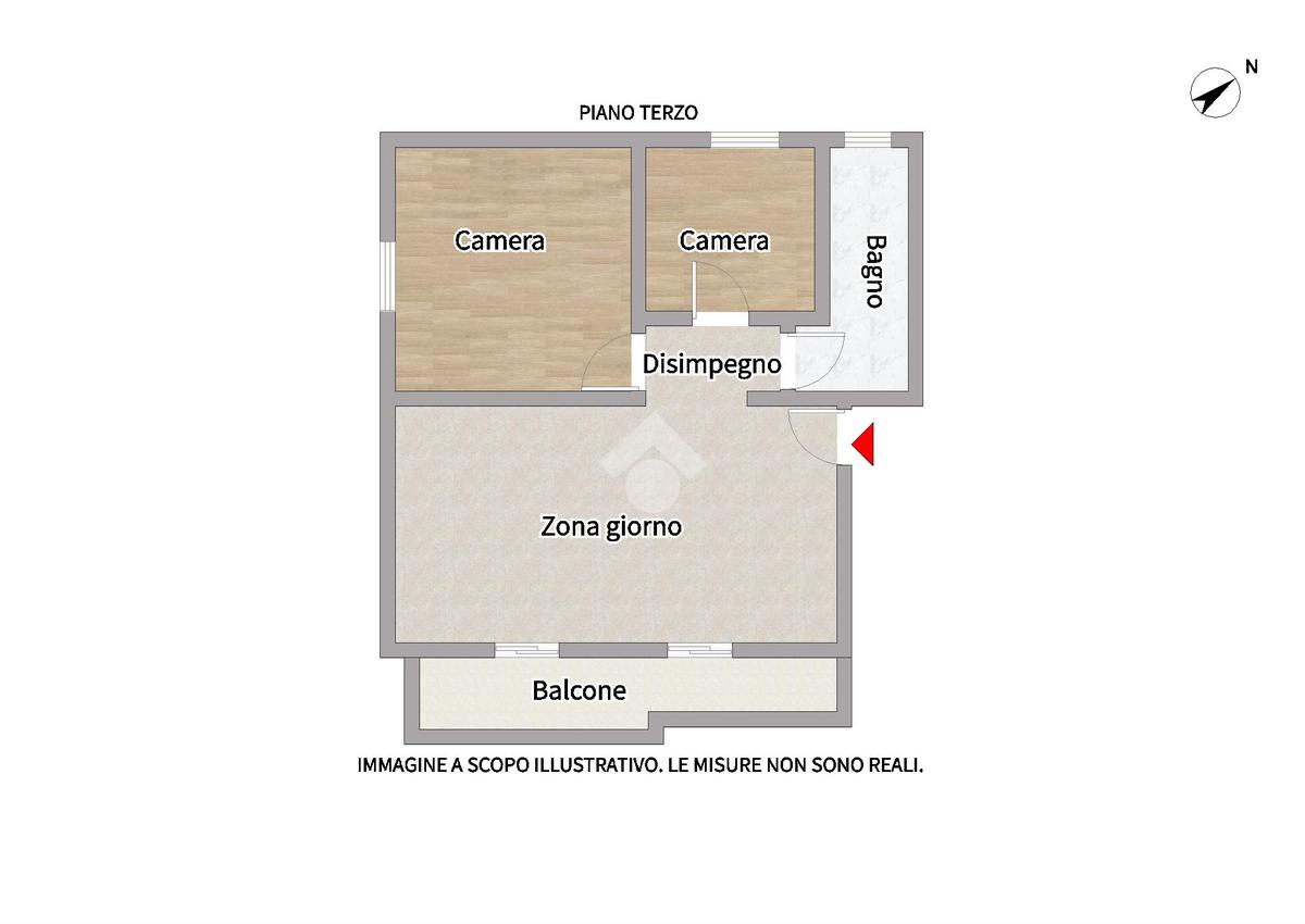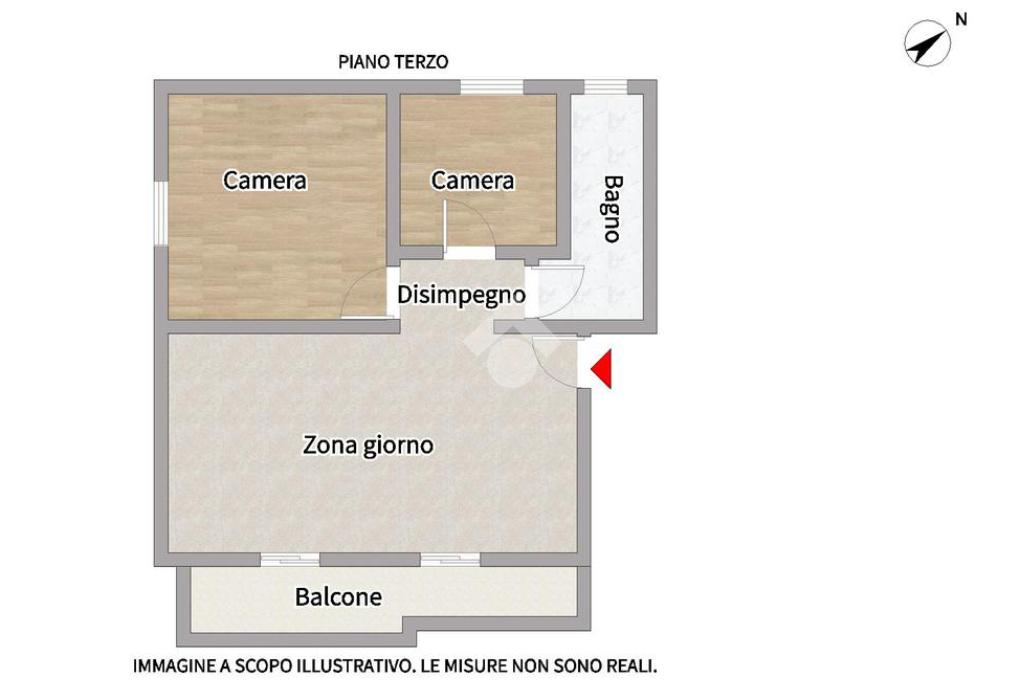 All'ingresso troviamo un'ampia zona giorno con cucina e accesso al balcone; attraverso il disimpegno accediamo alla zona notte, dove troviamo una camera da letto matrimoniale, una camera singola e un bagno finestrato con doccia.