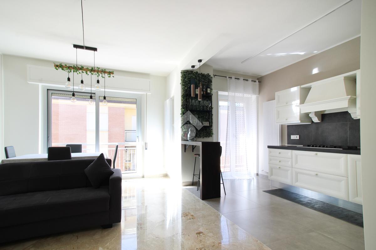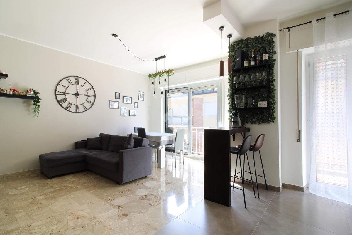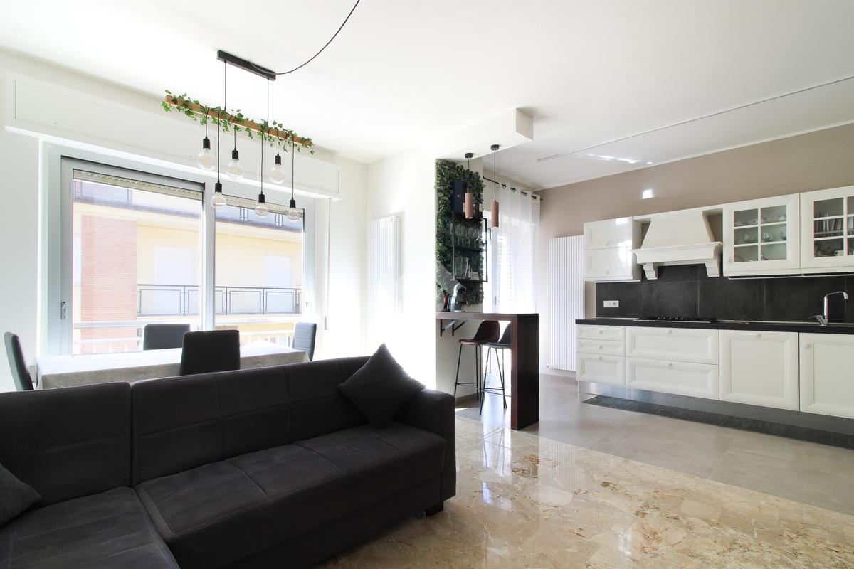All'ingresso troviamo un' ampia e luminosa zona giorno con angolo cottura e balcone.