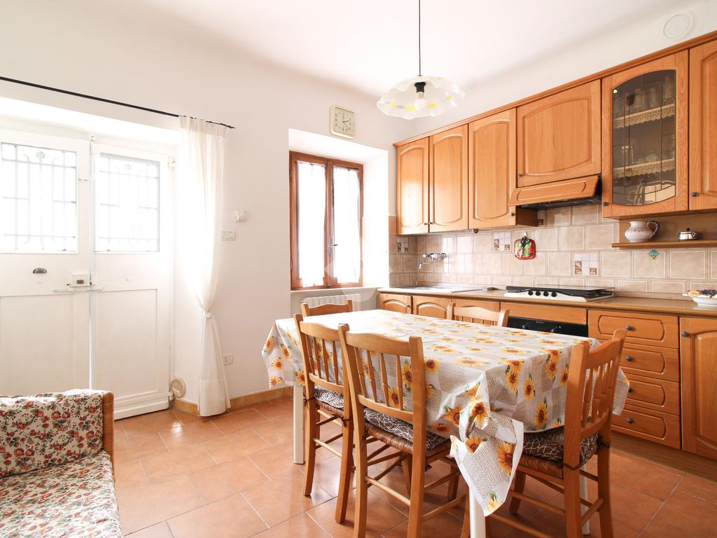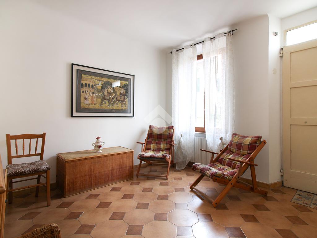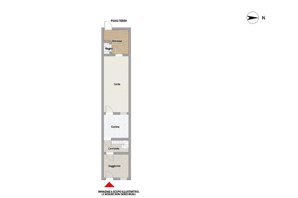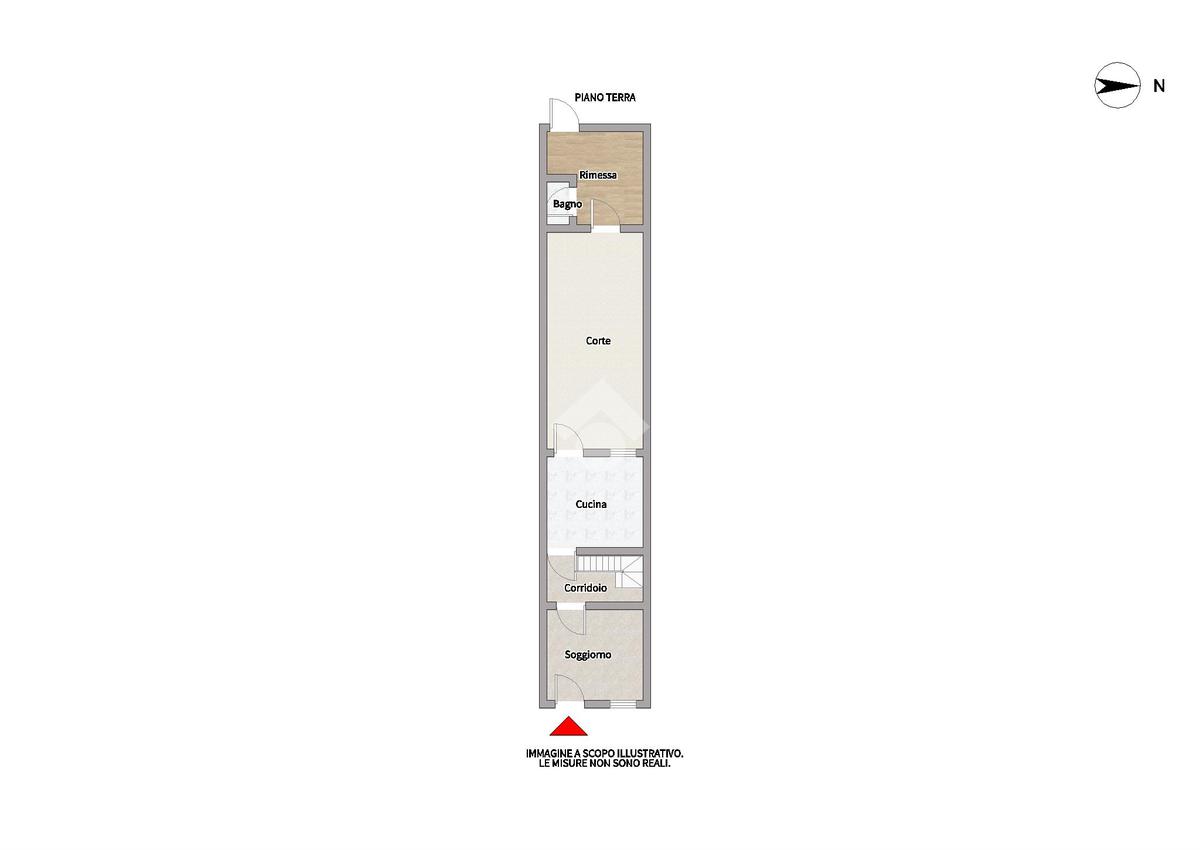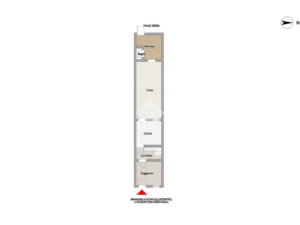 All'ingresso troviamo un soggiorno, cucina abitabile e corte privata. Dalla corte accediamo ad una rimessa con bagno di servizio.