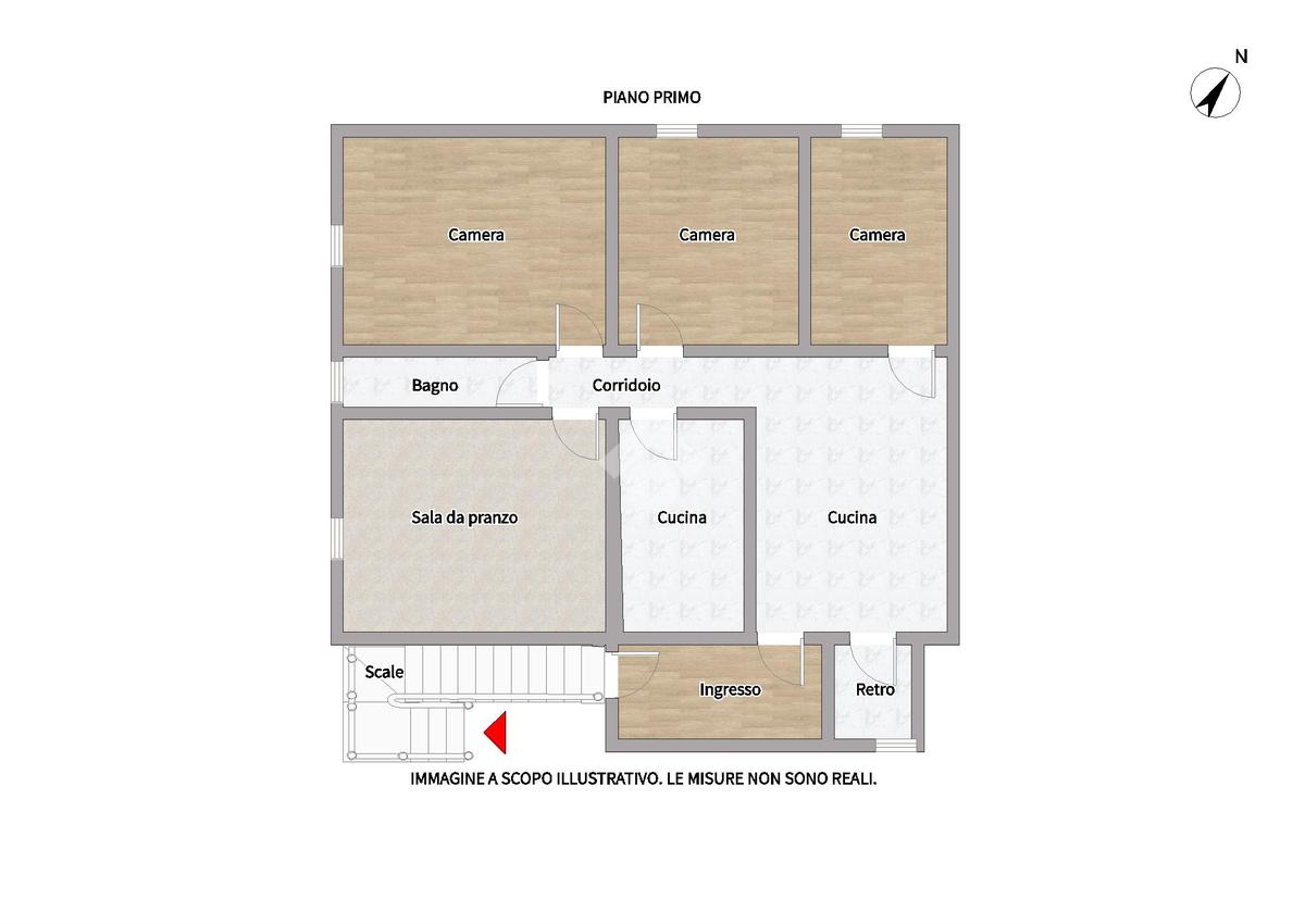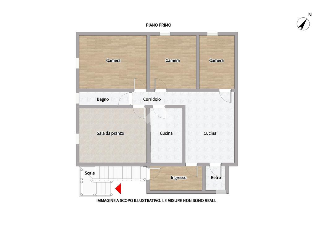 Attraverso una scala esterna, accediamo all'appartamento al primo piano, dove troviamo una cucina con retro, a seguire una sala da pranzo e tre camere da letto, infine un bagno finestrato.